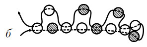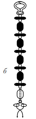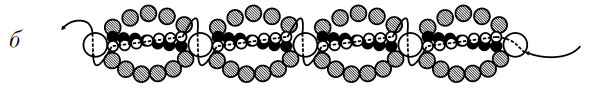 Закрепить концы скотчем и набирать бисер согласно схеме, приведенной на рисунке 10 а. Чем больше бисеринок набирается между бусинами-связками, тем более широким и ажурным получится ожерелье. Можно придумать много вариантов такого ожерелья, например, меняя цвет бисеринок и бусин или дополняя его различными подвесками (рис. 10 б).
