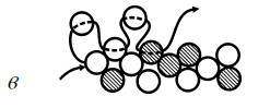 Вначале надо закрепить 2-ю нить на замочке. Затем пропустить ее через маленькую розовую бусину розовую и красную бисеринки. Набрать несколько красных бисеринок (количество определяется величиной бусин) и пропустить нить через 3 бисеринки ближнего крестика. Затем набрать столько же бисеринок и снова пропустить конец нити через бисеринки крестиков (рис. 13 в). Продолжать цикл до конца цепочки.