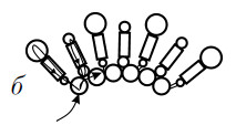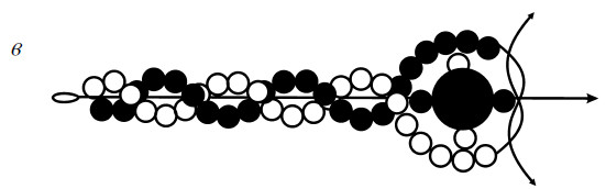 Набрать на 1 конец нити бусину-жемчужину, а на другой – прозрачную бисеринку, замкнуть все набранное в колечко, пропустив нить через 1-ю бисеринку (рис. 12 а). Для того чтобы цепочка закруглялась по вырезу горловины, с 1 стороны от ее центра набрать больше бисеринок, чем с другой (рис. 12 6). После того как цепочка наберет необходимую длину, закрепить на ее конце замочек и аккуратно заправить концы нити. Затем можно перейти к оплетению основной цепочки так, как показано на схеме: вначале 1 концом нити с иголкой, а затем 2-м концом пройти по другой стороне. Несмотря на простоту изготовления и лаконичность формы, это ожерелье эффектно смотрится как с повседневным костюмом, так и в качестве дополнения к вечернему наряду.