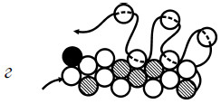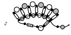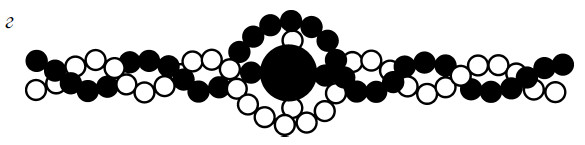 Ожерелье также плетется снизу вверх в технике мозаики (рис. 11 д). Нанизать на нить для 1-го ряда 9 бисеринок и замкнуть их в кольцо, протянув нить через 7-ю бисеринку ряда (рис. 11а).