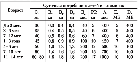 Потребность в витаминах у детей (в единицах на 1 кг массы тела) значительно больше, чем у взрослых, что объясняется более интенсивным обменом веществ в организме ребенка.