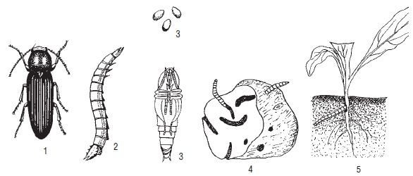 Рис. 8. Щелкун (проволочник): 1 – черный щелкун; 2 – личинка; 3 – яйца; 4 – куколка; 5 – поврежденный клубень картофеля; 6 – повреждения рассады