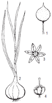 Рис. 22. Чеснок посевной: 1 – соцветие в чехле; 2 – общий вид растения; 3 – цветок (вид сверху); 4 – созревший плод с оставшимся столбиком
