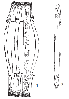Рис. 4. Прививка «мостиком»: 1 – штамб дерева с вставленными черенками; 2 – черенок