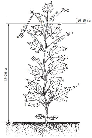 Для нормального роста и развития растений в пазухе первых 3–4 настоящих листьев делают «ослепление», т. е. удаляют (выщипывают) точки роста. Из последующих 5–6 листьев оставляют боковые побеги длиной до 20 см, а верхушки прищипывают. Выше по стеблю оставляют более длинные побеги 30–50 см, основной побег перекидывают через 2 проволоки, находящиеся через 20–30 см одна от другой и при достижении 60 см верхушку прищипывают (рис. 3).