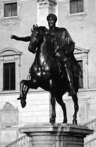 Платон сказал так: «Государство будет процветать, когда править будут философы, а правители станут заниматься философией». Эта фраза была одним из любимых высказываний императора Марка Аврелия – настоящего императора-философа, или, как сам он предпочитал, чтобы его называли, философа на троне. Его конная статуя выполнена из бронзы, размеры ее несколько превышают натуральные. Обе части этого скульптурного изображения – фигуры всадника и взнузданного коня – полые, основа их сделана из бронзы. Вся статуя покрыта позолотой и весит более 2000 кг.