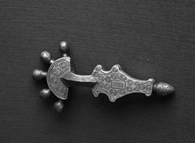 С другой стороны, вся фибула представляет собой змея (верхняя часть – его хвост). Змей – таинственное существо, обитающее в подземно-подводном мире, у корней «древа жизни». Он связан с истоками бытия, с тайной зарождения жизни и временными циклами, в рамках которых она разворачивается (спирали, покрывающие поверхность фибулы). Змей охраняет границу, отделяющую мир людей от мира предков, являясь хранителем изначальной мудрости и тайных знаний, покровителем волхвов и баянов.