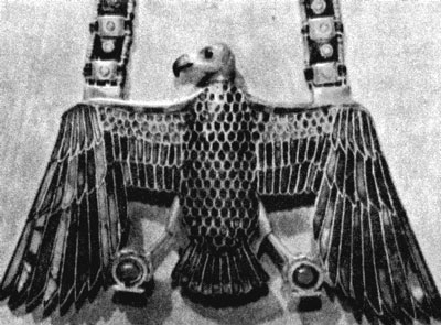 Рис. 1.5. Подвеска, обнаруженная на мумии Тутанхамона, – изображение богини – покровительницы Южного Египта Нехбет в облике коршуна. Перегородчатая эмаль с украшениями из лазурита, зеленого стекла и сердолика. Оборотная сторона из массивного литого золота. В когтях коршуна кольцо – символ вечного круговращения.