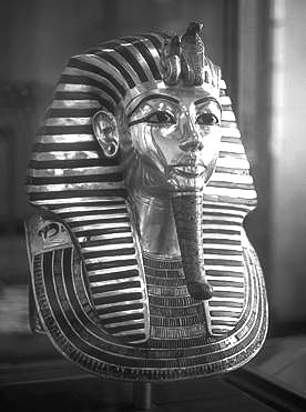 Рис. 1.4. Маска фараона Тутанхамона. Сделана из массивного кованого золота и инкрустирована цветной стеклянной пастой и драгоценными камнями. На лбу укреплены символы богинь – хранительниц власти царя – Уаджит и Нехбет – змея и коршун. Вес маски – 9 кг. Каир, Египетский музей.