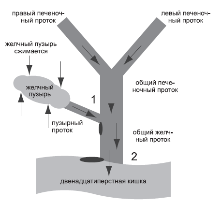 Во время еды желчь через систему клапанов-сфинктеров поступает в двенадцатиперстную кишку, проходя по специальным желчным путям. В двенадцатиперстной кишке она принимает участие в пищеварении. Между приемами пищи желчь поступает в желчный пузырь, где хранится и концентрируется (сгущается). А в нужный момент выбрасывается из пузыря в кишечник.