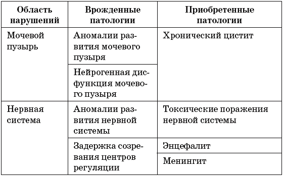 Уже в то время исследователи разделяли больных на несколько групп в зависимости от причины энуреза. Вот, например, классификация ученого А. А. Певницкого: к первой группе он относил пациентов с недостаточно развитым интеллектом (олигофренов), ко второй – страдающих органическими заболеваниями спинного мозга и расстройствами мочевого пузыря, к третьей – пациентов с миелодисплазией, к четвертой – больных диабетом, к пятой – лиц с болезненными процессами в мочевом пузыре и уретре, к шестой – людей, у которых энурез развился на почве нервного и мышечного истощения (в основном группу составляют дети и взрослые после тяжелых инфекционных заболеваний), к седьмой – всех остальных, не относящихся к первым шести группам. Большое значение придавали существовавшему нередко в то время «наследственному сифилису» (имелся в виду сифилис, который ребенок получал внутриутробно от матери, больной сифилисом).