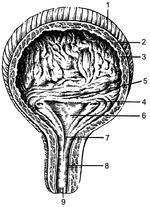 Рис. 6. Строение мочевого пузыря: 1, 2 – мышечные слои; 3 – слизистая; 4 – внутренние отверстия мочеточников; 5 – складка; 6 – треугольник; 7 – внутреннее отверстие уретры; 8 – уретра; 9 – наружное отверстие уретры
