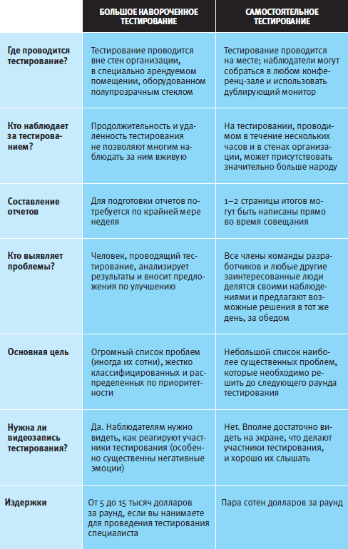 «Самостоятельному тестированию» доступно не все, что доступно Большому Навороченному тестированию, но оно достигает результатов, которые вам нужны, за ту цену, которую вы можете себе позволить. Перед вами сводная таблица различий, существующих между двумя этими типами тестирования (все элементы этой таблицы будут подробно прокомментированы в следующих главах):