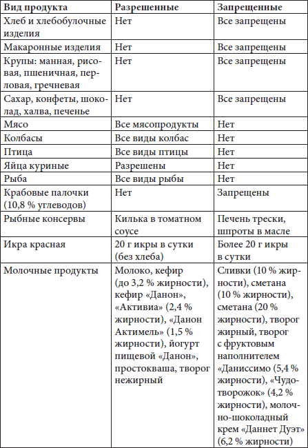 Таким образом, любой вид продукта может быть или разрешенным, или запрещенным, в зависимости от процентного содержания в нем жиров или углеводов (табл. 1).