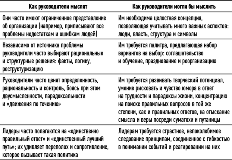 Многофреймовое мышление требует выхода за пределы узких и механистических способов понимания организаций. Трудно сказать, сколько раз руководители говорили нам, что они находили «единственно правильное» решение проблем. Такие заявления обнажают недостаток и воображения, и мужества, выдают парализующий страх перед неопределенностью. Возможно, удобно думать, что неудача была неизбежна и мы сделали все, что могли. Но невероятно раскрепощающим может быть понимание, что всегда есть и другие способы решения любой проблемы. Те, кто владеет искусством рефрейминга, говорят об ощущении выбора и могущества. Руководители лишены свободы только в той степени, в какой их сдерживает палитра имеющихся идей.
