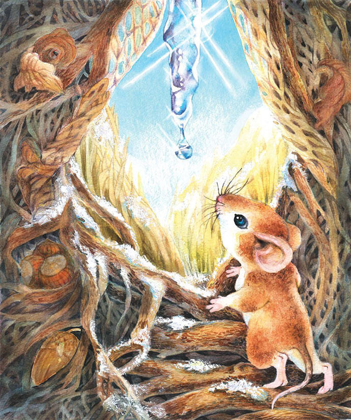 Но вот однажды утром Мышонок услышал странный звук: «кап, кап, кап, кап». Мышонку стало очень любопытно, он тихонько приблизился к выходу из норки и с удивлением увидел, что там что-то сияет. Заворожённый, подошёл Мышонок ближе и остановился. Он увидел, как что-то впереди сверкает и переливается всеми цветами. И вдруг это что-то сорвалось сверху, и раздался тихий звук «кап». Перед самым выходом из норки выросла сосулька, с её конца скатывались капли. Вот новая капля появилась, налилась сиянием и светом, и заискрилась, как драгоценный камень. Вот и она сорвалась и пропала, и только раздалось эхом это непонятное Мышонку «кап».