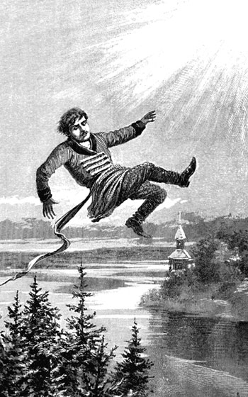 Пошли; сперва сел на весы Иван-царевич, а потом и ведьма полезла; только ступила ногой, так Ивана-царевича вверх и подбросило, да с такою силою, что он прямо попал на небо, к Солнцевой сестре в терема; а ведьма-змея осталась на земле.