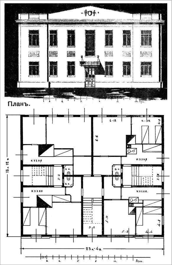 Проект двухэтажного доходного дома размером 12 × 16 метров: 8 двухкомнатных квартир, теплый ватерклозет, кухня с уголком для постели прислуги. Каждая квартира имеет парадный и черный ходы. Альбом проектов Г. М. Судейкина. 1916 г.
