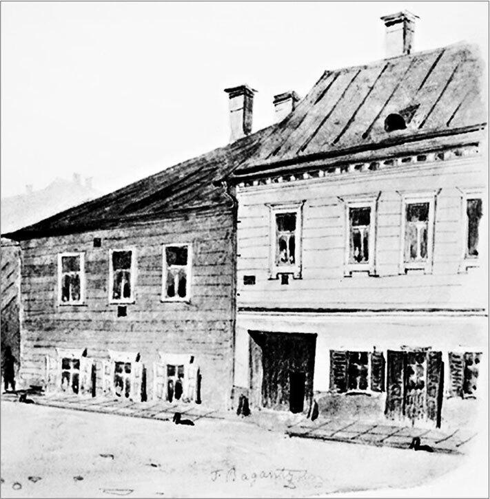 Смешанный дом: первый этаж каменный, а второй деревянный на Малой Итальянской. Акварель Ф. Ф. Баганца. 1860-е гг. Фрагмент