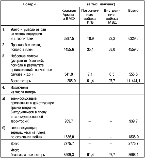Мы не собираемся разбирать или опровергать их расчеты. В данной работе нас в первую очередь интересуют безвозвратные людские потери Вооруженных сил СССР в Великой Отечественной войне. Их принято обычно рассматривать с военно-оперативной и демографической точек зрения.