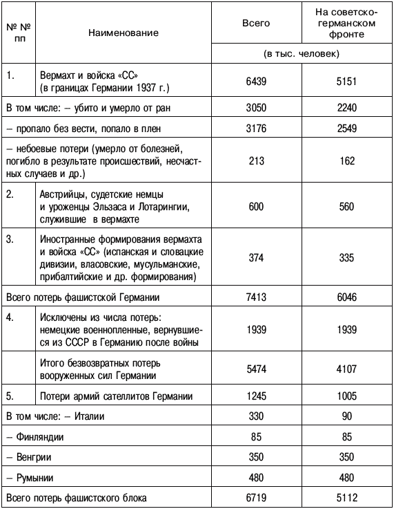 Примечание: В число безвозвратных потерь фашистской Германии не вошли иностранцы, находившиеся в тыловых частях и учреждениях, на строительных и других работах (учет этой категории лиц в немецких документах отсутствует).