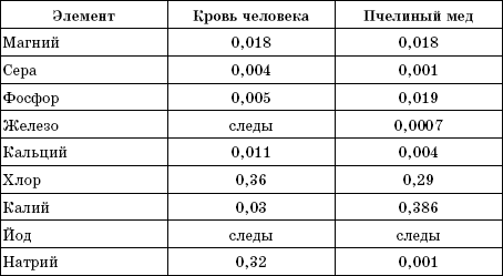 Чрезвычайно важно, что многие микроэлементы находятся в меде в такой же концентрации и в таком же соотношении друг с другом, как и в крови человека. В таблице представлен минеральный состав сыворотки крови человека и меда (в %).