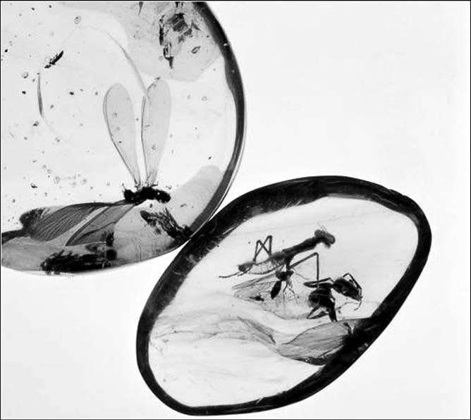 А от комах найчастіше знаходять у бурштині, який утворився зі смоли викопних дерев. Під час спеки дерева починали «плакати» смолою, в яку й потрапляли необережні дрібні комахи. Потім краплі смоли разом із деревами вкривалися осадовими породами, дерева кам’яніли, смола перетворювалась на бурштин, а комахи зберігалися мов законсервовані. Вони й зараз виглядають так, немов загинули лише кілька днів тому. Але насправді це не так. Всередині бурштинового уламка лишилася пустотіла форма, вистелена тонісінькою плівкою з решток загиблої істоти чи шматочка рослини.