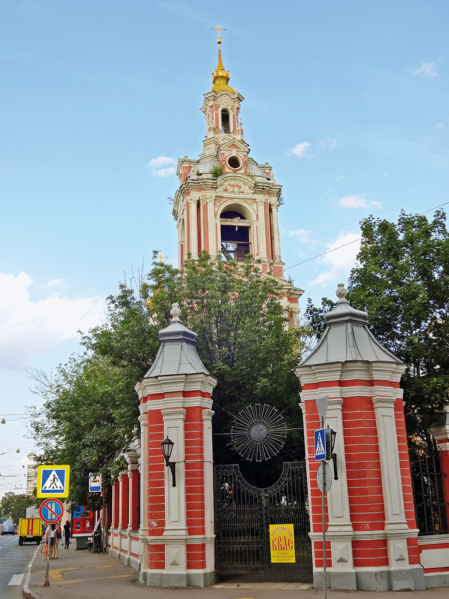 Мы вышли к величественному храму Никиты Мученика, который был построен в 1751 году архитектором Д. В. Ухтомским. Расположен храм на месте деревянной церкви, возведенной еще при Василии III, в 1517 году, в память пребывания в Москве иконы Владимирской Богоматери, с освященными в ней приделами великомученика Никиты и Рождества Иоанна Предтечи. Храм, как и несколько дворянских особняков, уцелел во время бушевавшего пожара 1812 года. В советское время на Старой Басманной появилось несколько новых зданий (больше всего вблизи Садового кольца, мы идем в обратную сторону от него). Но общий вид древней улицы сохранился. Это старая дореволюционная малоэтажная Москва.