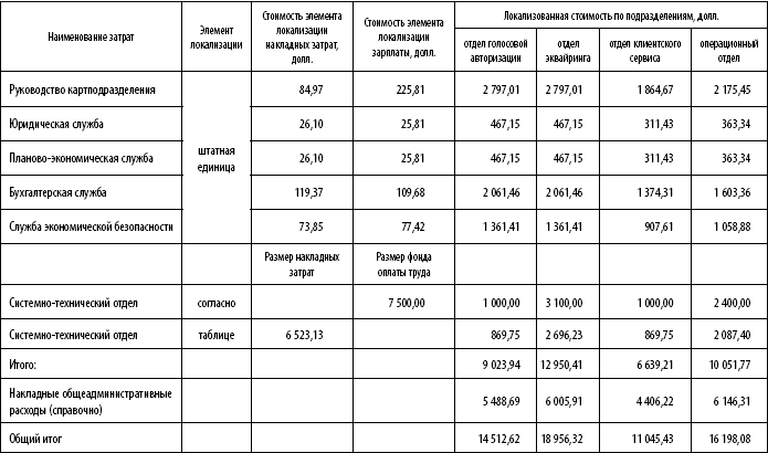 Этап 4. Завершающий этап локализации является обобщением предыдущих. На нем проводится окончательное распределение затрат по видам операций. Предварительно сделаем допущение, что отдел авторизации обслуживает эквайринговые операции 2/3 рабочего времени и 1/3 тратит на сервис держателей эмитированных карт. В такой же пропорции распределим затраты, связанные с этим подразделением, между видами операций (табл. 11).