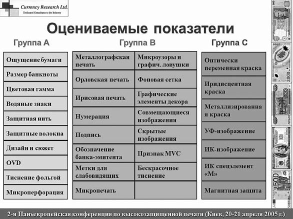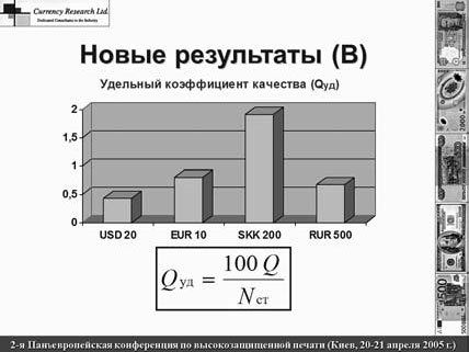 Таким образом, сравнивались ранее оценивавшиеся банкноты с новыми: и по номиналу (20 долл. США, 10 евро, 500 и 1000 российских рублей и 200 словацких крон), и по качеству, и по концепции дизайна, и по уровню защиты.