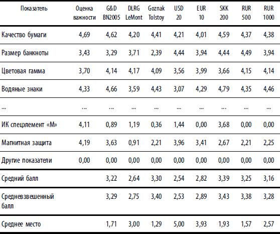 Отметим некоторые из полученных результатов. По оценкам экспертов, в среднем наиболее качественными являются образец «Лев Толстой» производства Гознака, банкноты 200 словацких крон и 500 российских рублей, которые были признаны более качественными по отношению к банкноте 10 евро в отличие от предыдущего испытания (банкнота в 5 евро была тогда признана наилучшей, табл. 1.1.5). Банкнота «нового поколения» NexGen достоинством 20 долл. США так же, как и предыдущая (5 долл.), была оценена экспертами как наименее качественная, несмотря на серьезные нововведения как в ее дизайне, так и в защите.