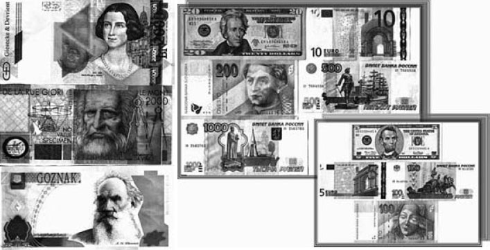 Поэтому в сентябре – октябре 2004 г. мы провели следующий раунд оценивания качества банкнот. Стиль и детали проведения оценки были модернизированы, исходя из предыдущего опыта и новых задач. В этом случае эксперты оценивали 3 образца («BN2005» Giesecke и Devrient, «Le Mont 2000» De La Rue Giori, «Лев Толстой» производства Гознака, рис. 1.1.21) и 5 банкнот, находящихся в реальном обращении (20 долларов США NexGen, 10 евро, 200 словацких крон, 500 и 1000 российских рублей модификации 2004 г., рис. 1.1.21). Таким образом, мы перешли к более высоким номиналам и соответственно уровню исполнения и защиты. Предварительно была запланирована оценка 4 банкнот приблизительно одной нарицательной стоимости. Банкнота более высокого номинала, 1000 российских рублей, была добавлена согласно пожеланиям Банка России, чтобы оценить эффективность некоторых изменений, и при расчете экономических показателей не учитывалась.