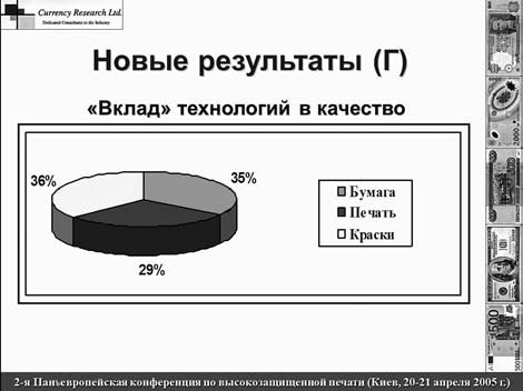 Результаты этого раунда оценки качества банкнот обеспечили возможность определения эффективности введения различных новых защитных признаков как с точки зрения отдельных экспертных групп, так и в целом. Этому способствовала большая проведенная работа: в течение первого цикла исследований было выполнено 3600 оценок различных показателей качества, во втором цикле – более 4000.