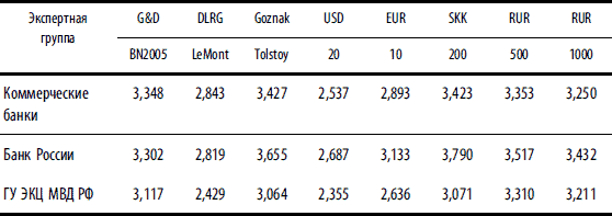 Характерно, что в этом отношении специалисты всех экспертных групп были единодушны и средневзвешенный балл качества банкноты 20 долл. США самый низкий у всех экспертных групп (табл. 1.1.7).