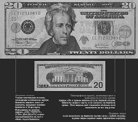 О новой серии долларов США NexGen необходимо сказать отдельно. Первые банкноты достоинством 20 долл. были выпущены в обращение 9 октября 2003 г. Их внешний вид и защитные признаки показаны на информационном буклете Федеральной резервной системы США (рис. 1.1.37).