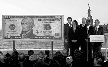 Рис. 1.1.35. Представление новой банкноты 10 долларов США на фоне статуи Свободы