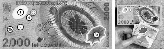 В качестве примера рассмотрим некоторые защитные признаки банкноты достоинством 2000 лей (рис. 1.2.10), выпущенной в обращение Национальным банком Румынии в 1999 г. в связи с вступлением в новое тысячелетие и посвященной солнечному затмению 11 августа 1999 г.