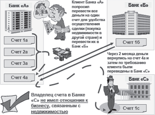 Далее рассмотрим пример, который показывает, насколько полезно бывает изучать характер самой сделки и ее экономическое обоснование (рис. 4). Один клиент банка «А» достаточно успешно действовал на рынке недвижимости, получая каждый год значительные доходы. Ему помогали члены его семьи. В банке «А» были открыты несколько счетов в разных валютах для удобства расчетов. Однажды клиент попросил перевести все деньги на один счет (сумма превышала 1 млн дол.). Свою просьбу он обосновывал тем, что хочет купить дорогую недвижимость в другой стране. Средства были собраны в один счет и переведены далее на счет в другой стране.