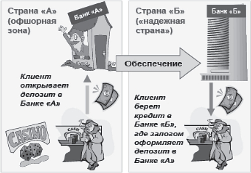 Клиент открывает депозит в банке «А», расположенном в офшорной зоне (страна «А»). Известно, что офшорная зона имеет ряд особенностей: запрет на выдачу информации, льготное налогообложение и др. Затем уже в другой стране с развитой экономикой и хорошей репутацией (страна «Б») клиент берет кредит в банке «Б» на сумму депозита, а в качестве обеспечения предъявляет гарантии банка страны «А», в котором размещен депозит. Когда наступает время погашения процентов и (или) основного долга, клиент заявляет о невозможности погасить задолженность и просит обратиться в банк страны «А» для погашения кредита. Данный пример показывает, что таким способом клиент получает законное обоснование имеющимся у него деньгам, другими словами, легализует деньги, полученные от незаконной деятельности.