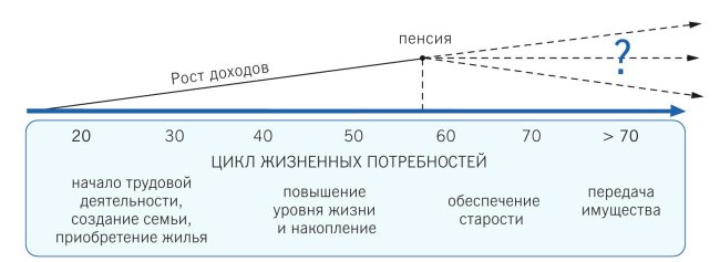 • в современном мире планирование событий жизненного цикла серьезно зависит от личного планирования собственных финансов и благосостояния, необходимого для обеспечения дохода после выхода на пенсию, финансирования образования детей, оплаты жилья и создания страховки на случай кризисных ситуаций;