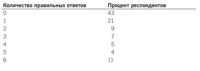 Что касается базовых навыков финансовой арифметики, то 43 % респондентов не смогли правильно ответить ни на один из шести вопросов, предполагающих вычисления (понимание вопроса, процентная ставка, инфляция и т. д.). Только 11 % респондентов правильно ответили на все вопросы (табл. 1.2).