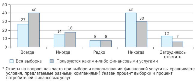 3. Сравнение альтернативных финансовых услуг (продуктов). 40 % респондентов никогда не сравнивают условия, предлагаемые различными поставщиками финансовых услуг (рис. 1.11).