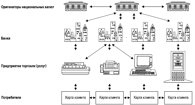 Каждый из участников расчетов, включая оригинатора, банки, предприятия торговли (услуг) и клиентов, являются держателями карт соответствующего класса, максимально допустимая сумма которых и перечень операций, которые возможно совершать с использованием этих карт, определяются правилами оригинатора. Правила взаимодействия карт в зоне ответственности оригинатора каждой валюты устанавливаются управляющим органом оригинатора в соответствии с требованиями национального законодательства (рис. 7).