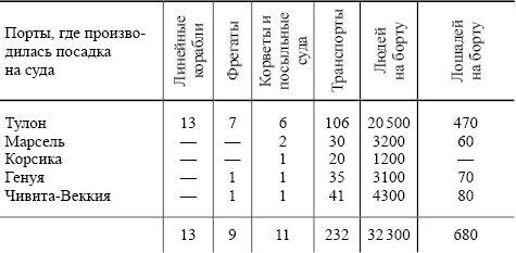 Английские эскадры ушли из Средиземного моря в конце 1796 г., когда неаполитанский король заключил мир. С этого времени трехцветный флаг[4] господствовал в Адриатике, в Леванте и вплоть до Гибралтарского пролива. Успешное продвижение Восточной армии зависело от того, насколько удастся сохранить в тайне подготовку к экспедиции. Наполеон в качестве главнокомандующего Английской армией объехал прежде всего лагеря на Ла-Манше, делая вид, что занимается только ими, но на самом деле занимаясь по-настоящему только Восточной армией. Из городов Фландрии и Бельгии, которые он посетил, Наполеон отправлял курьеров, которые доставляли его приказы на побережье Средиземного моря. Он взял на себя руководство всей подготовкой на суше и на море. Флот, конвой, армия – все это было приведено в состояние готовности за несколько недель. Он переписывался с генералами: Каффарелли – в Тулоне, Ренье – в Марселе, Барагэ-д'Илье – в Генуе, Дезэ – в Чивита-Веккии, Вобуа – на Корсике. Эти пять уполномоченных им лиц заготовляли продовольствие, собирали и вооружали суда с такой энергией, что 15 апреля войска совершили посадку на корабли в пяти портах. Командующим оставалось только ждать приказа об отплытии. Состав экспедиции был следующим: