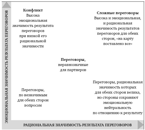 Для удобства восприятия типов переговоров представим себе матрицу. Вертикальный вектор этой матрицы назовем «Эмоциональная значимость результатов переговоров», а горизонтальный вектор – «Рациональная значимость результатов переговоров».