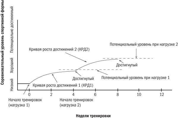 На рис. 1.1 и 1.2 вы можете заметить еще одну особенность: после введения новой тренировочной программы на первом этапе скорость достижения результатов высока, но со временем она падает. Наибольший рост спортивной формы приходится на первые шесть недель после введения новой программы. Но и на последующих этапах любая тренировочная программа продолжает приносить плоды, пусть и менее очевидные: даже без увеличения нагрузок изменение состава тела (потеря ненужного жира, например) может продолжаться, приводя, в свою очередь, к некоторому росту результатов.