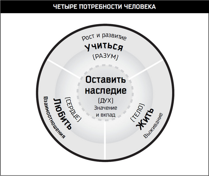 Во всех философских и религиозных учениях, как западных, так и восточных, на протяжении всей письменной истории мы, по существу, обнаруживаем те же четыре измерения: физическое/экономическое, интеллектуальное, социально-эмоциональное и духовное. Термины используются разные, однако измерения жизни универсальны. Эти измерения также отражают четыре основные потребности и мотива всех людей: жить (выживание), любить (взаимоотношения), учиться (рост и развитие) и оставить после себя наследие (смысл и вклад) – см. рис. 2.3.