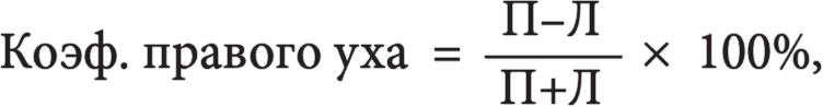 Методика дихотического прослушивания позволяет определять не только асимметрию слухового восприятия (то есть преимущество правого или левого уха), но и коэффициент этой асимметрии по формуле: