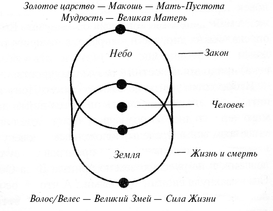 Для женского начала в этой схеме центром и осью является Небо/Закон/Жизнь, для мужского начала центром и осью является Земля/Любовь/Жизнь и Смерть.