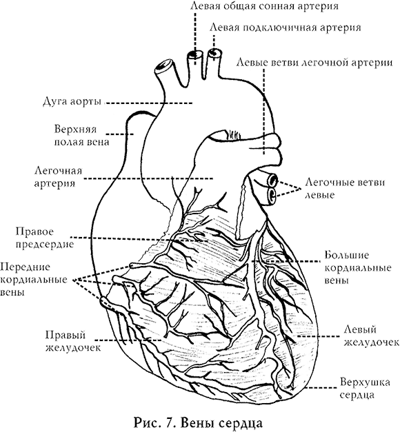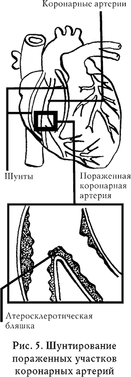 Как мы уже неоднократно говорили, холестерин откладывается в стенках сосудов. У лиц с высоким содержанием холестерина в крови (более 6,48 ммоль/л) степень риска отложения холестерина в стенках сосудов возрастает в 4 раза по сравнению с теми людьми, у которых определяется нормаль ный уровень. Накапливаясь, холестерин приводит к утолщению сосудистой стенки изнутри, что сопровождается сужением просвета сосуда и нарушением кровотока (рис. 5).